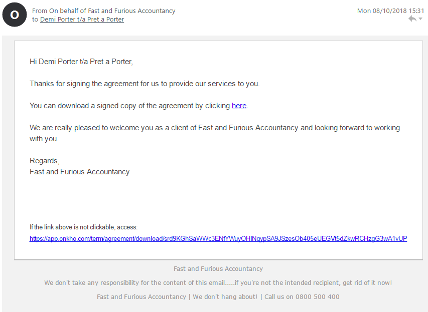 If there is more than one signatory, your client will receive a final email with a download link for the signed agreement for their records: